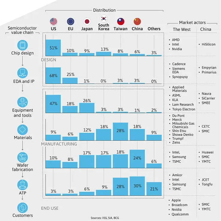 Enligt ett briefingdokument från GSIS (Global Security & Innovation Summit), som hänvisar till data från International Institute for Strategic Studies (IISS), Semiconductor Industry Association (SIA) och Boston Consulting Group (BCG), dominerar USA design och immateriella rättigheter inom halvledarnas värdekedja, medan östasiatiska ekonomier har ledande positioner inom tillverkning, material och kapsling.