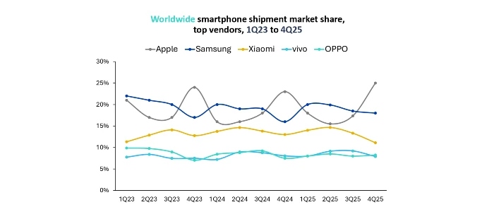 Apple var störst under kvartalet med 25 procent av marknaden och levererade enligt Omdia ett rekordstarkt fjärde kvartal, främst tack vare iPhone 17-serien. Företaget avslutade också helåret 2025 som världens största smartphonetillverkare för tredje året i rad, precis före Samsung.